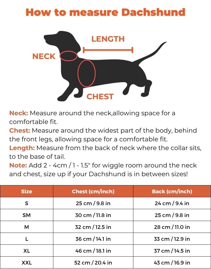 Use our size chart and measure your dachshund’s back length and chest for the best fit.